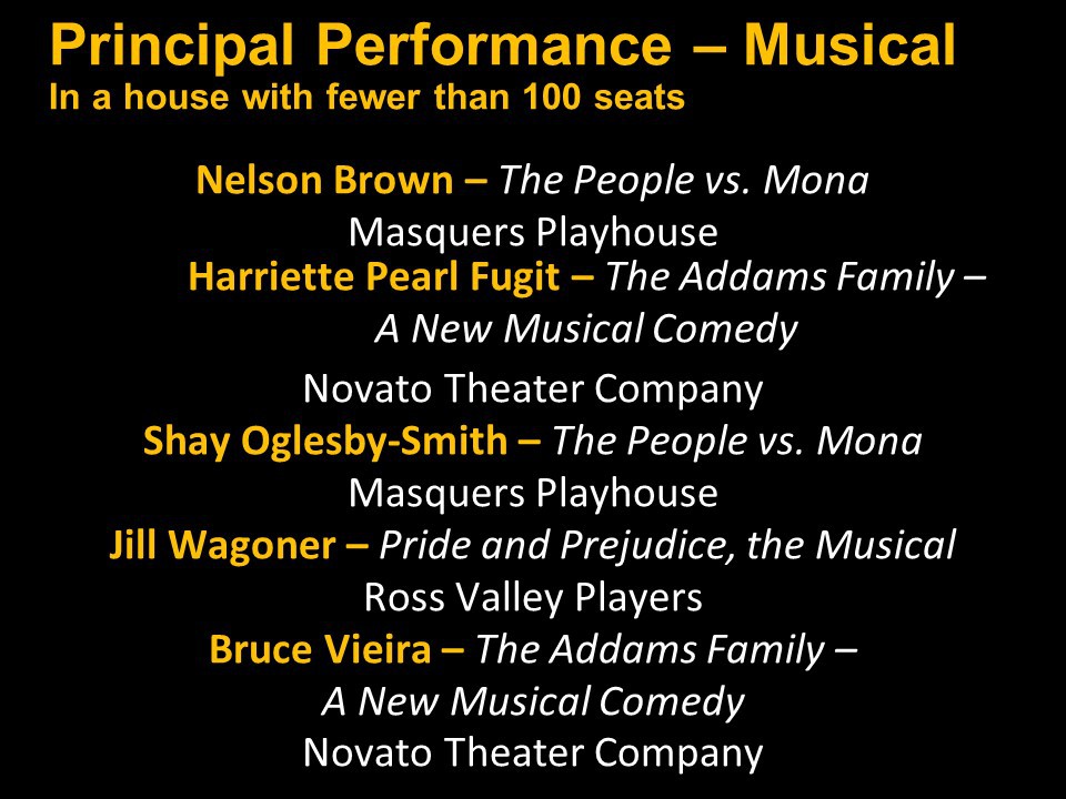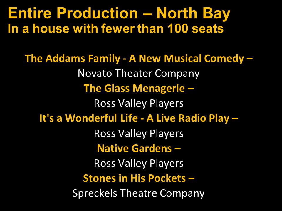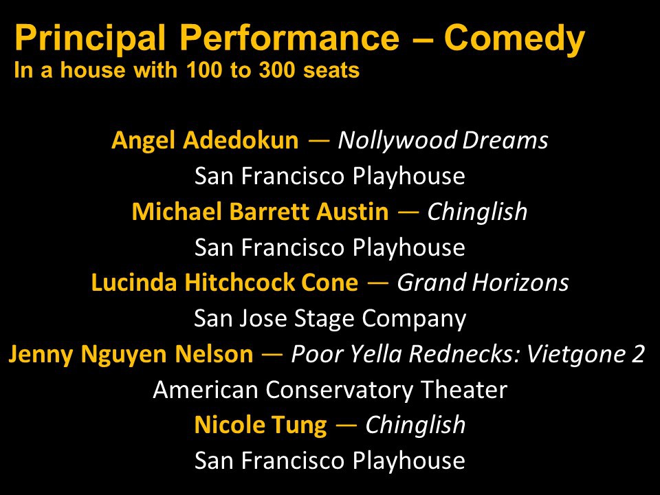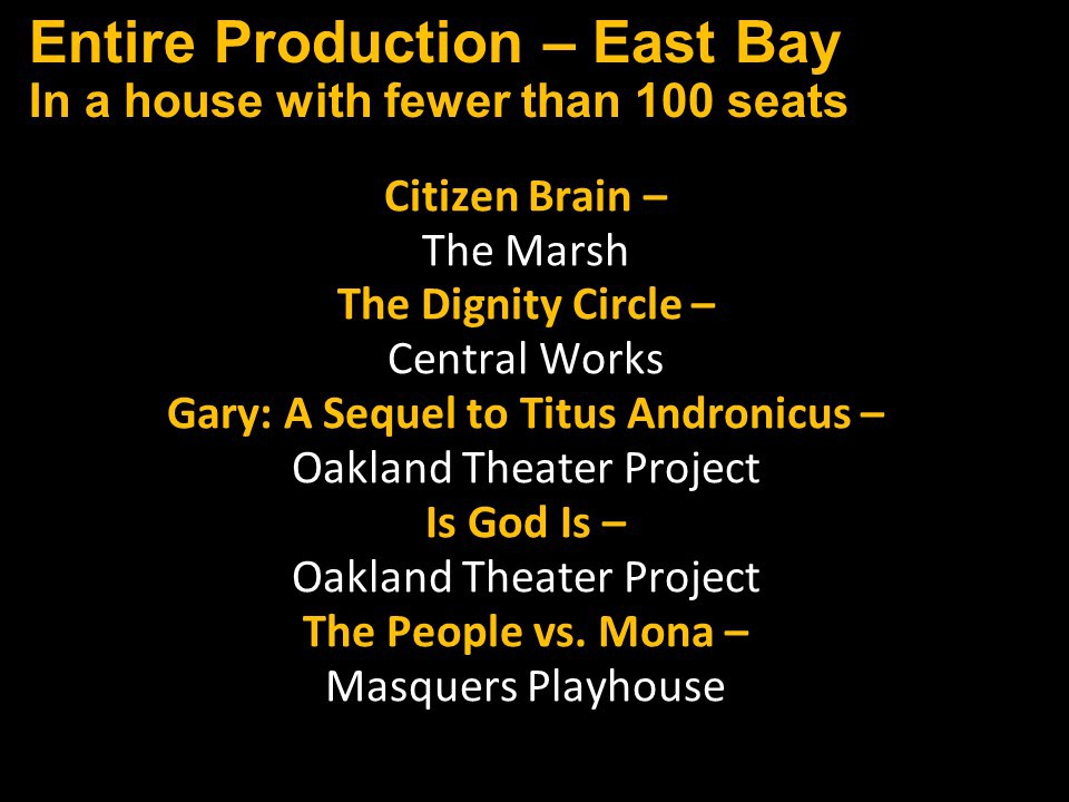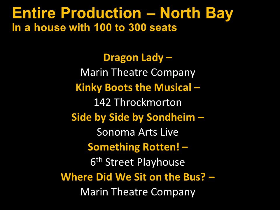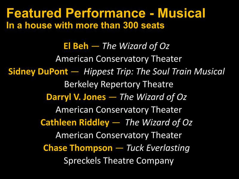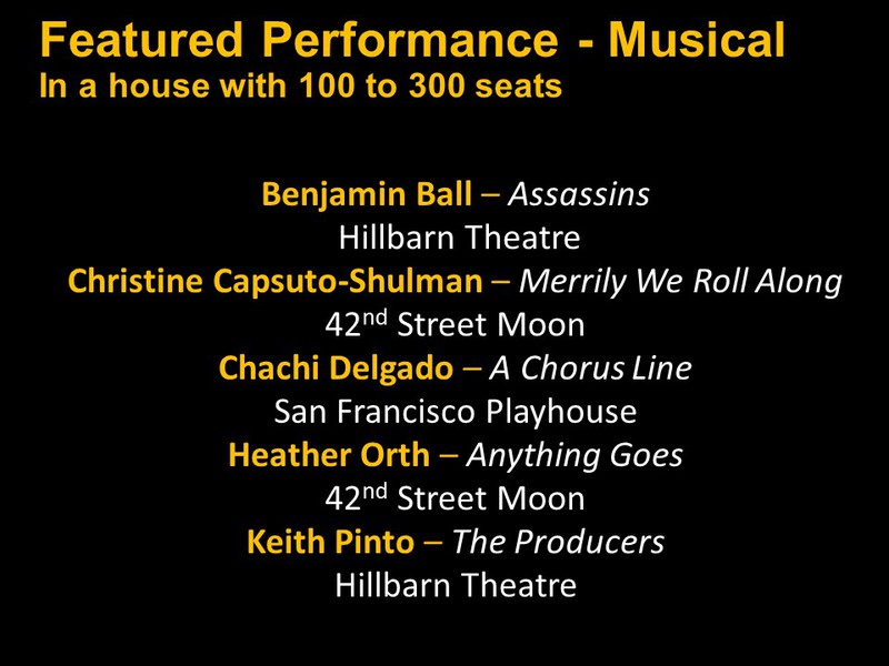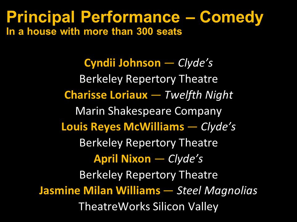 Featured Performance - Comedy, Principal Performance - Musical, Musical Direction, Principal Performance - Comedy, Stage Direction, Principal Performance - Drama, Ensemble in a Comedy/Drama/Musical, Entire Production by Region, Entire Production - Bay Area