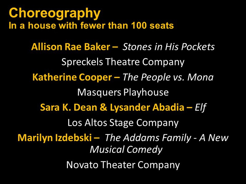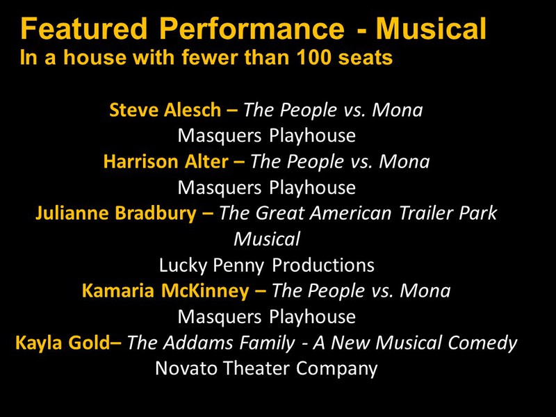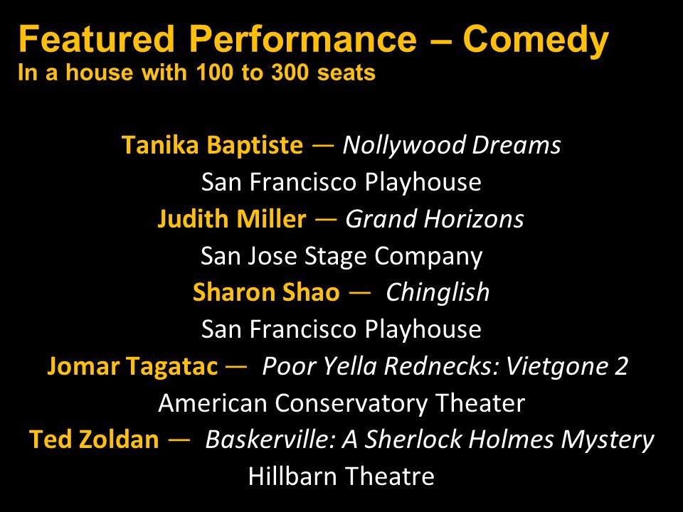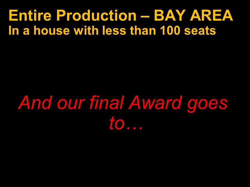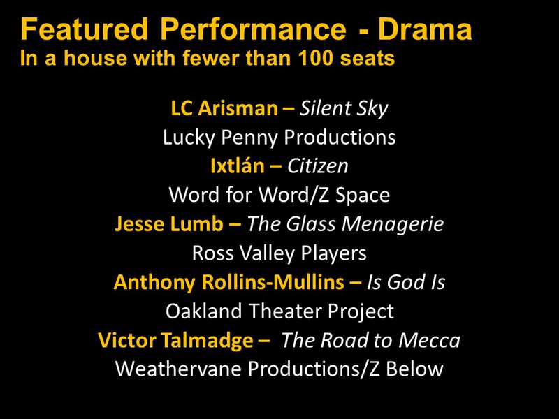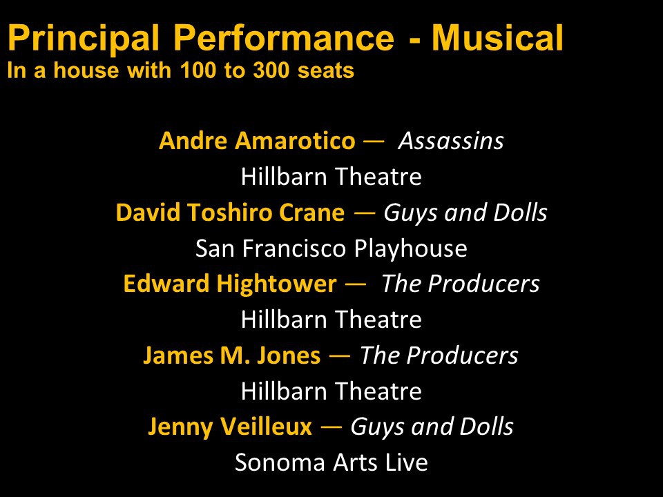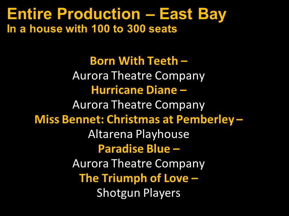 Featured Performance - Comedy, Principal Performance - Musical, Musical Direction, Principal Performance - Comedy, Stage Direction, Principal Performance - Drama, Ensemble in a Comedy/Drama/Musical, Entire Production by Region, Entire Production - Bay Area