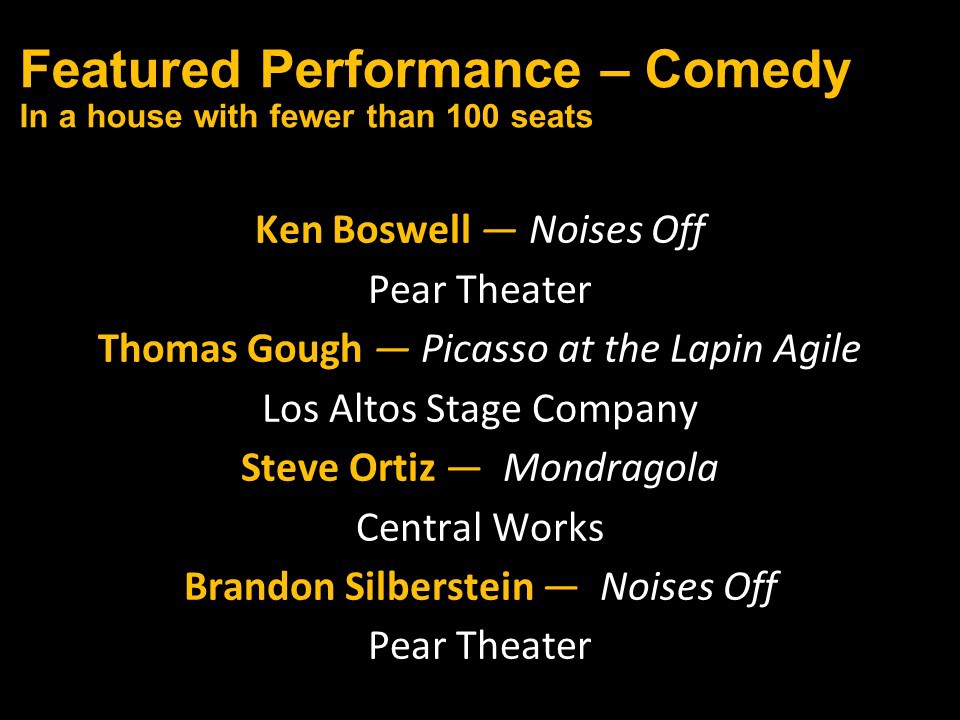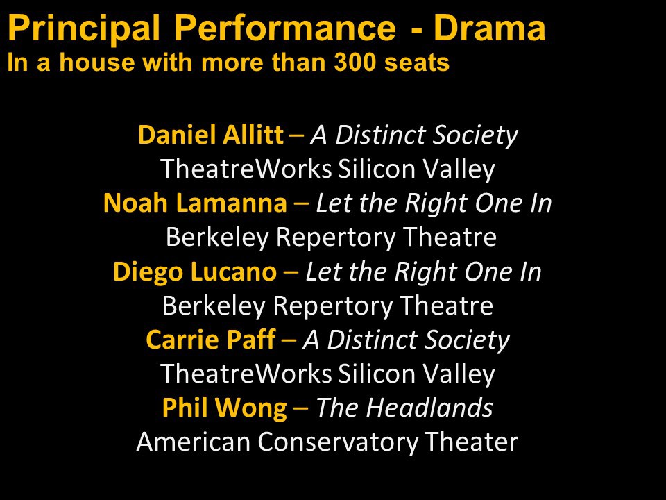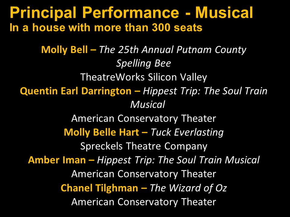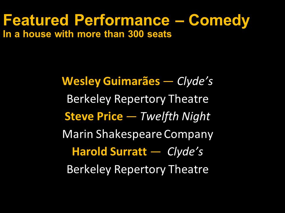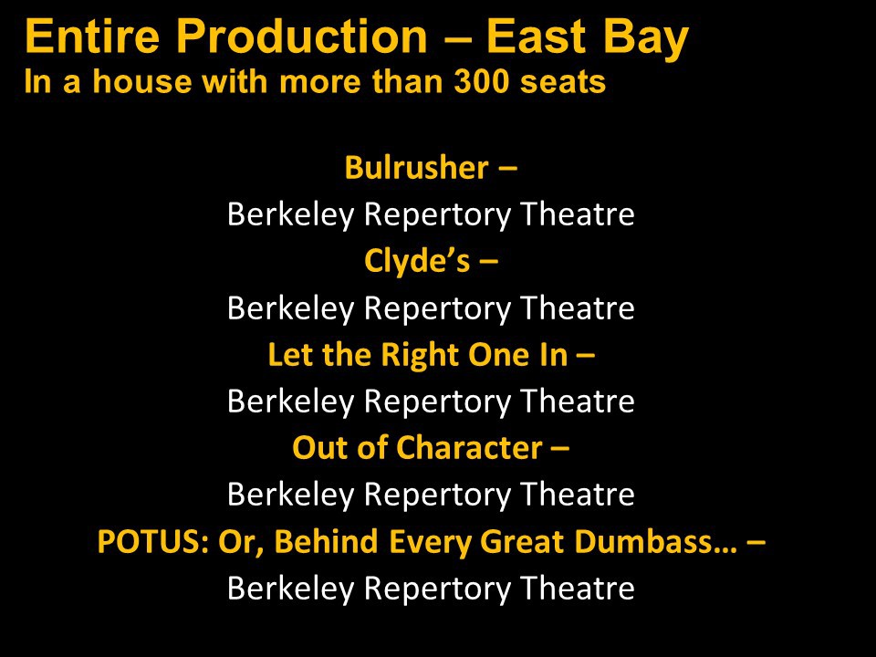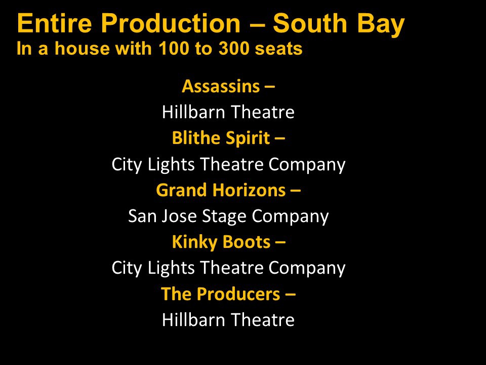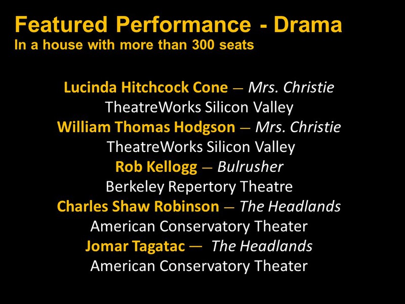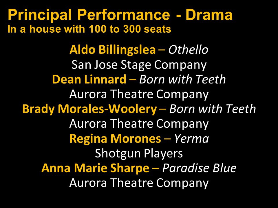 Featured Performance - Comedy, Principal Performance - Musical, Musical Direction, Principal Performance - Comedy, Stage Direction, Principal Performance - Drama, Ensemble in a Comedy/Drama/Musical, Entire Production by Region, Entire Production - Bay Area