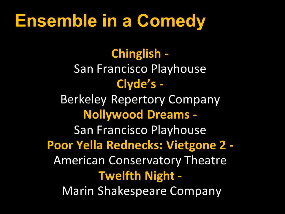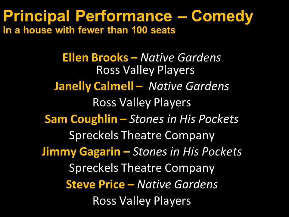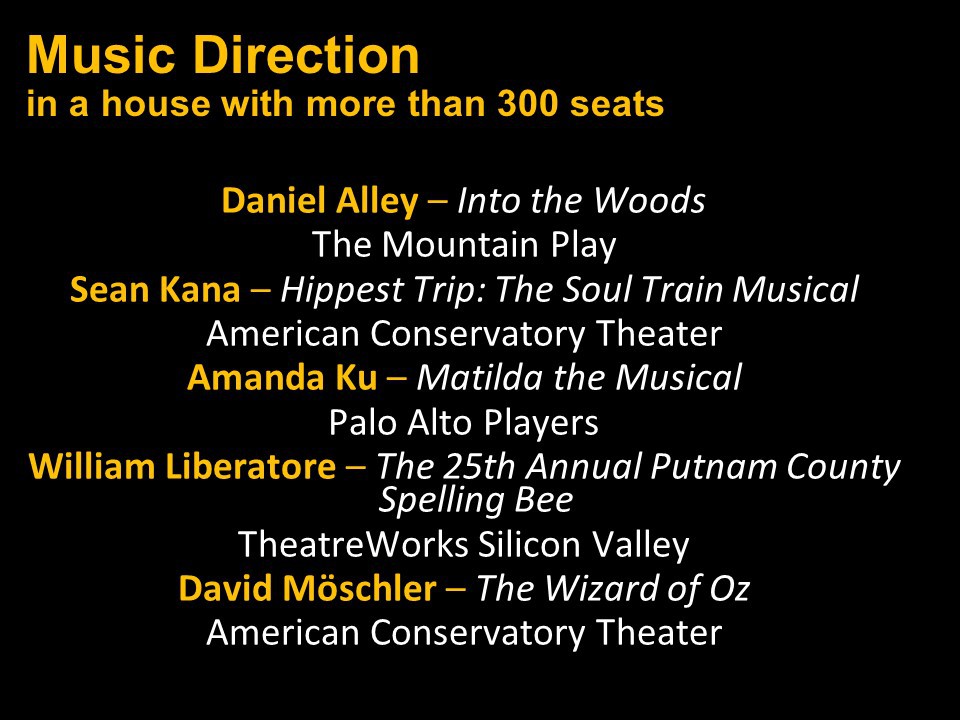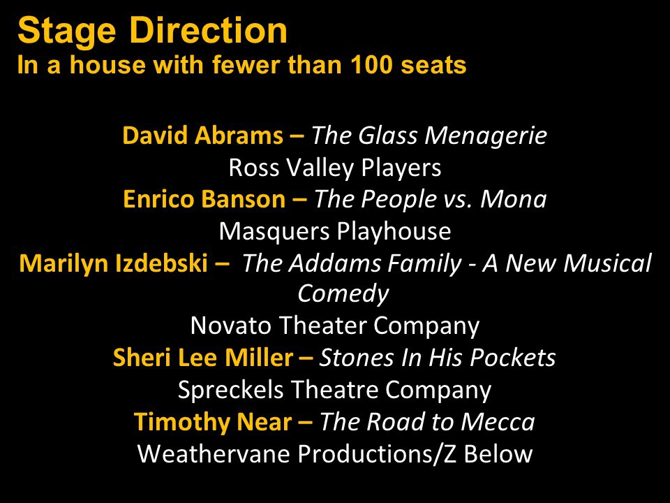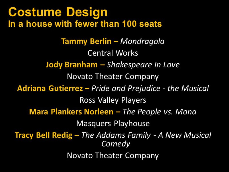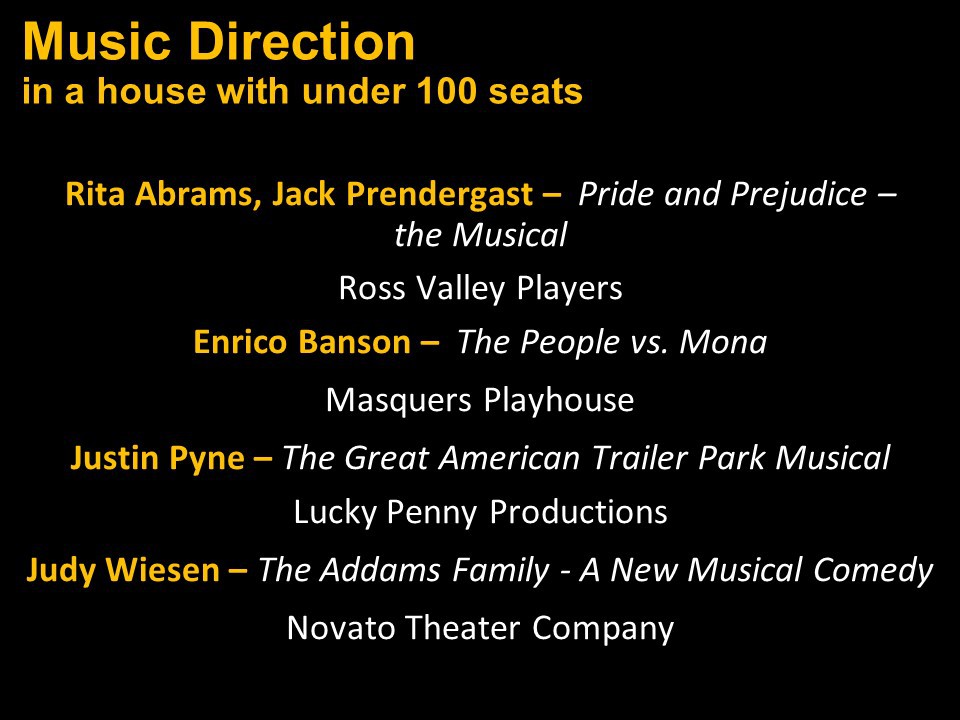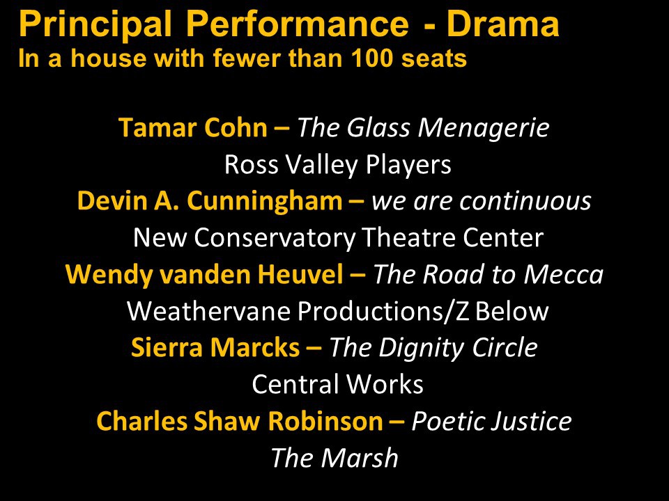 Featured Performance - Comedy, Principal Performance - Musical, Musical Direction, Principal Performance - Comedy, Stage Direction, Principal Performance - Drama, Ensemble in a Comedy/Drama/Musical, Entire Production by Region, Entire Production - Bay Area