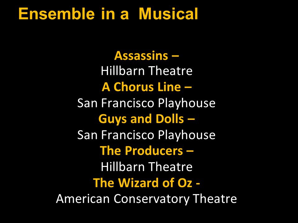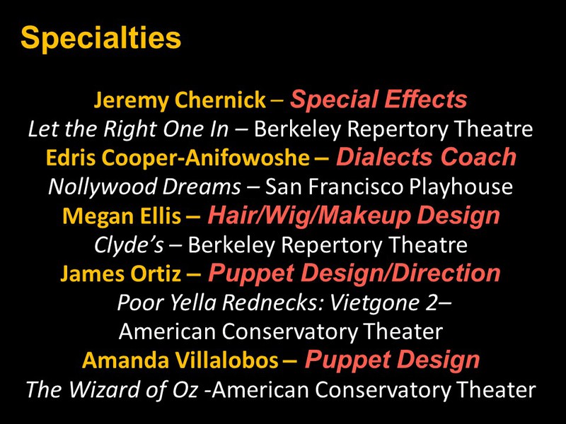 Featured Performance - Drama, Original Music, Costume Design, Featured Performance - Musical, Lighting Design, Original Script, Choreography, Sound Design, Solo Performance, Set Design, Specialties, Projection Design